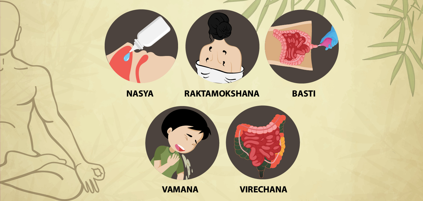 Virechana (purgation), Basti (medicated enemas), Nasya (nasal therapy) and Raktamokshana